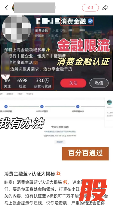 为了降低风险,部分中介还会在各地注册空壳消费金融公司,为核心账号进行蓝 V认证,进一步提升账号可信度。这种玩法,将平台的风控规则利用到极致,也让小红书的金融生态陷入“流量狂欢”与“合规隐忧”的双重困境。