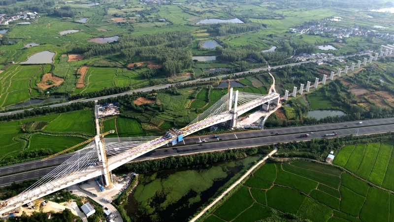 2025年7月28日,新建沪宁合高铁安徽段跨沪陕高速公路特大桥完成合龙。据悉,新建上海至南京至合肥高速铁路是国家中长期铁路网规划“八纵八横”中沿江通道的重要组成部分,是江北沿江城市与南京都市圈、上海都市圈快速直达的快捷通道。新华社记者 刘军喜 摄