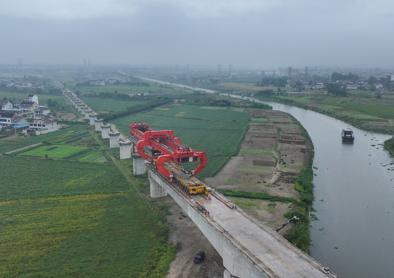 2025年9月24日,中铁十一局新建沪宁合高铁沪宁段通泰扬特大桥箱梁架设现场。新建上海至南京至合肥高速铁路是国家中长期铁路网规划“八纵八横”中沿江通道的重要组成部分,是江北沿江城市与南京都市圈、上海都市圈快速直达的快捷通道。新华社记者 季春鹏 摄